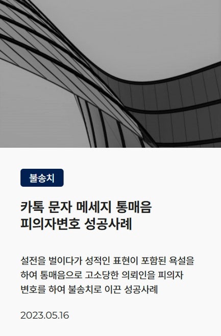 사건을 맡은 저희는 통매음 사건의 판례들을 세세하게 분석하여 의뢰인에게 '성적인 목적이 없었음'을 여러 입증 자료와 함께 강력히 주장했습니다.