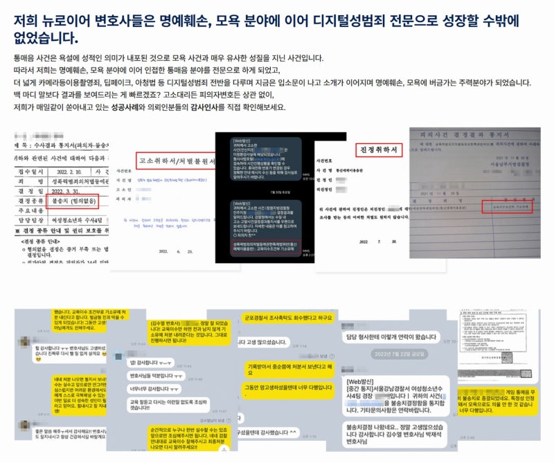 뉴로이어 법률사무소의 통매음 업무사례 중 일부,
