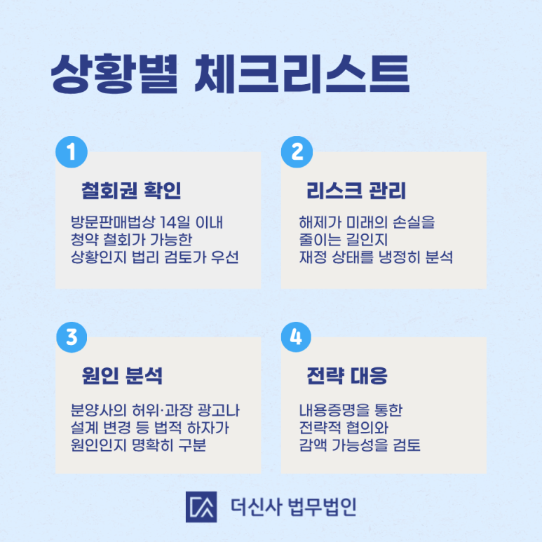 이처럼 분양계약취소는 단순히 마음이 변해서가 아니라, 방문판매법 적용 가능성을 법리적으로 검토하는 것이 해결의 시작입니다.