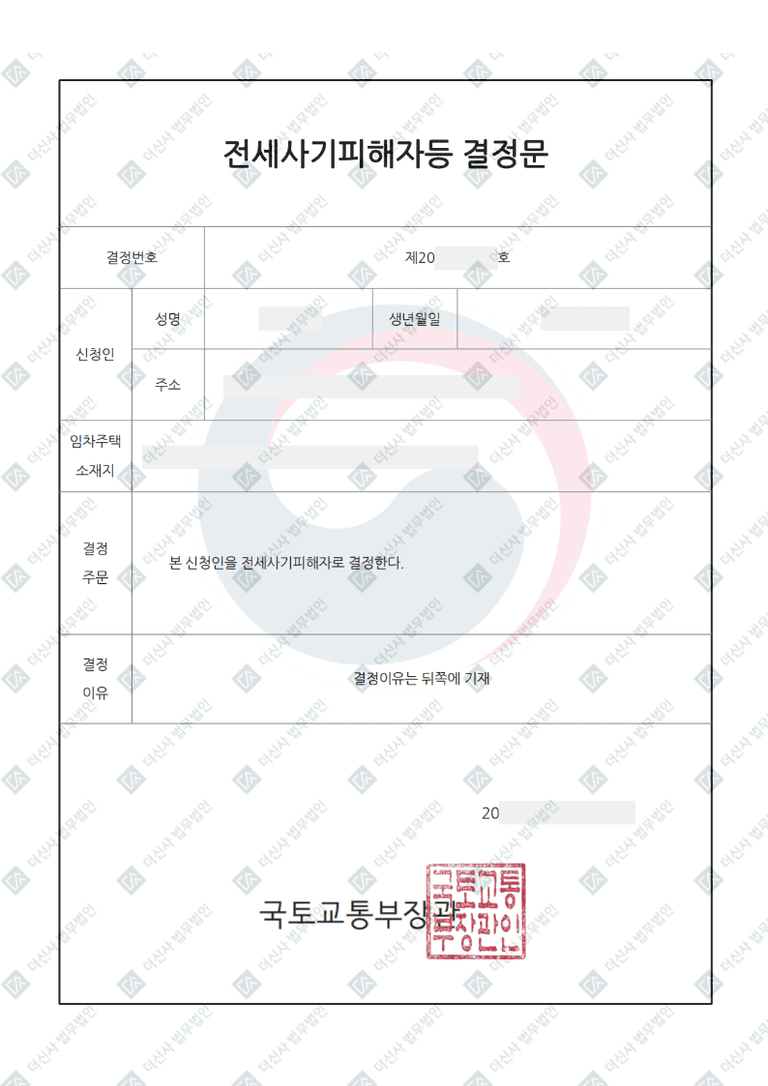 본 법무법인의 면밀한 법리 검토와 자료 준비 끝에, 의뢰인은 국토교통부로부터 최종 '전세사기피해자'로 결정되었습니다.