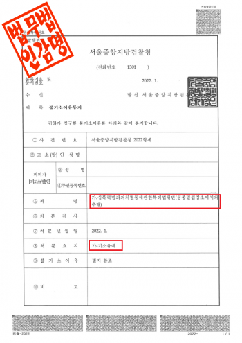 서울중앙지방검찰청은 이 사건에 대해 다음과 같은 사유로 불기소 처분을 하였습니다.