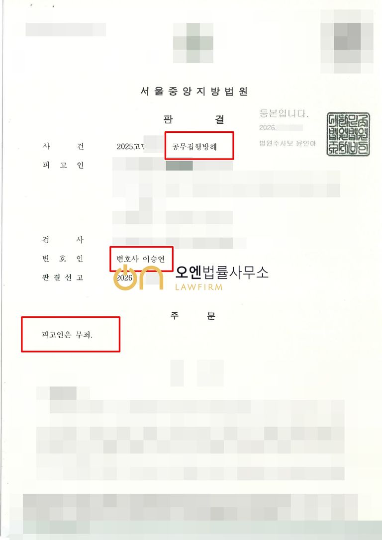 당시 의뢰인은 현행범 체포되어 혐의에 대해 모두 인정한 상태였으나, 오엔법률사무소는 법리적으로 공무집행방해죄의 구성요건인 ‘폭행 또는 협박’에 해당하지 않다고 판단하였습니다. 이에 의뢰인이 주먹으로 운전석 창문을 친 사실이 없는 점, 의뢰인이 차량의 문을 열었던 것은 차량이 정차 중이었던 상황인 점, 위 상황이 10여 초에 불과한 짧은 순간 동안 이루어진 점, 이후 순순히 체포에 응한 점 등에 비추어 ‘폭행 또는 협박’에 해당하지 않는다는 이유로 무죄를 주장하였습니다.