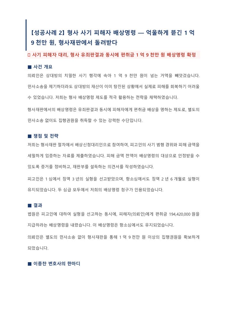 형사 사기 피해자 대리, 유죄판결과 동시에 1억 9천만원배상명령