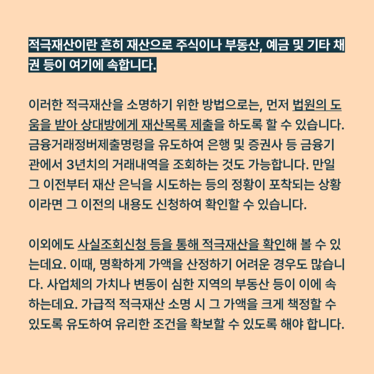 이외에도 사실조회신청 등을 통해 적극재산을 확인해 볼 수 있는데요. 이때, 명확하게 가액을 산정하기 어려운 경우도 많습니다. 사업체의 가치나 변동이 심한 지역의 부동산 등이 이에 속하는데요. 가급적 적극재산 소명 시 그 가액을 크게 책정할 수 있도록 유도하여 유리한 조건을 확보할 수 있도록 해야 합니다.