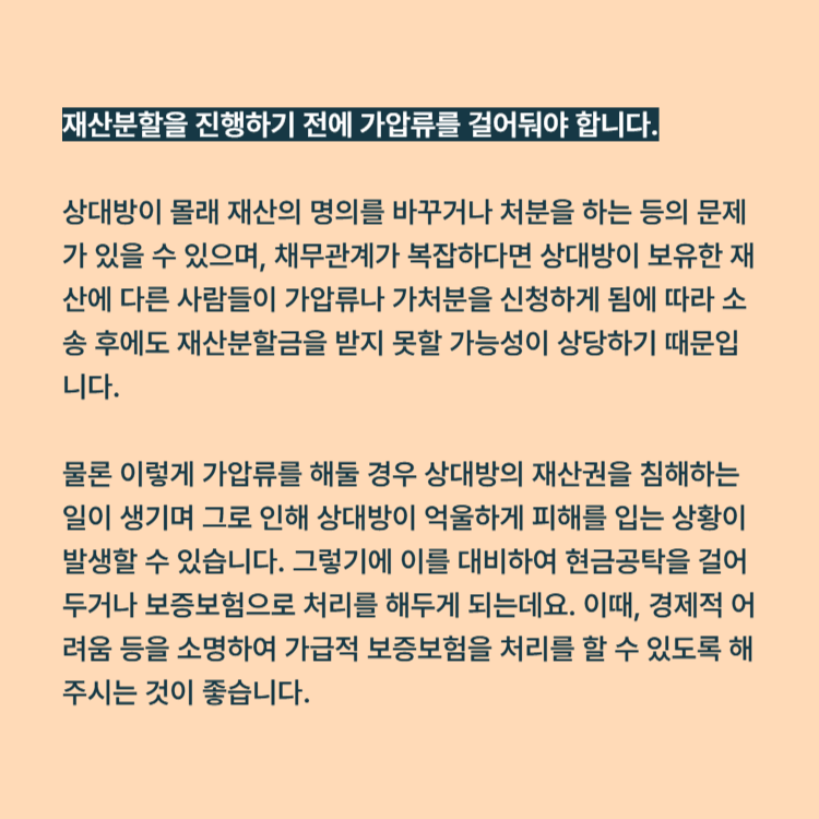 본격적으로 재산분할을 진행하기 전에 가압류를 걸어두시는 것이 좋습니다. 상대방이 몰래 재산의 명의를 바꾸거나 처분을 하는 등의 문제가 있을 수 있으며, 채무관계가 복잡하다면 상대방이 보유한 재산에 다른 사람들이 가압류나 가처분을 신청하게 됨에 따라 소송 후에도 재산분할금을 받지 못할 가능성이 상당하기 때문입니다. 따라서 이렇게 재산분할금 보전이 어려울 것이라 판단이 된다면 가압류를 청구하여 청구금액이 보전될 수 있도록 해야 합니다.