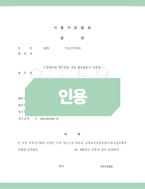 물론 이렇게 가압류를 해둘 경우 상대방의 재산권을 침해하는 일이 생기며 그로 인해 상대방이 억울하게 피해를 입는 상황이 발생할 수 있습니다. 그렇기에 이를 대비하여 현금공탁을 걸어두거나 보증보험으로 처리를 해두게 되는데요. 이때, 경제적 어려움 등을 소명하여 가급적 보증보험을 처리를 할 수 있도록 해주시는 것이 좋습니다. 또한 상대방의 적극재산 소명을 통해 충분히 가압류가 가능한 조건이라는 점을 강조하여 무사히 보전처분이 내려올 수 있도록 해야 합니다.