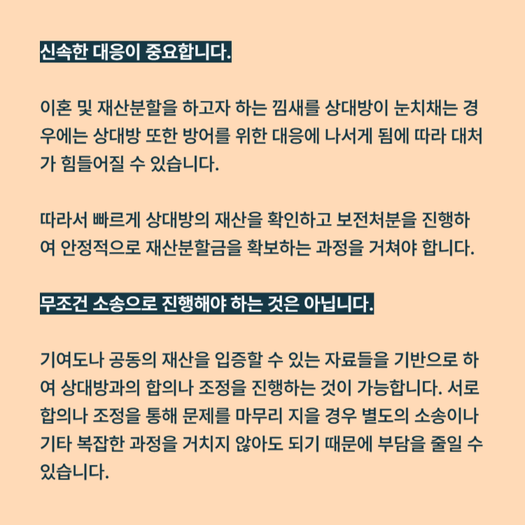 만일 이혼 및 재산분할을 하고자 한다면 빠르게 과정을 진행해 보시는 것이 좋습니다. 이혼 및 재산분할을 하고자 하는 낌새를 상대방이 눈치채는 경우에는 상대방 또한 방어를 위한 대응에 나서게 됨에 따라 대처가 힘들어질 수 있습니다. 따라서 빠르게 상대방의 재산을 확인하고 보전처분을 진행하여 안정적으로 재산분할금을 확보하는 과정을 거쳐야 합니다.