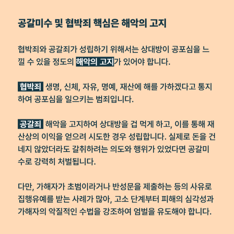 많은 피해자가 "실제로 때린 건 아니니까", "돈을 준 건 아니니까"라며 망설입니다. 하지만 법원은 제3자의 관점에서 보았을 때 충분히 위협적인 발언이었다면 혐의를 인정합니다. 다만, 가해자가 초범이라거나 반성문을 제출하는 등의 사유로 솜방망이 처벌(집행유예 등)을 받는 사례가 많으므로, 고소 단계부터 피해의 심각성과 가해자의 악질적인 수법을 구체적으로 강조하여 엄벌을 유도해야 합니다.