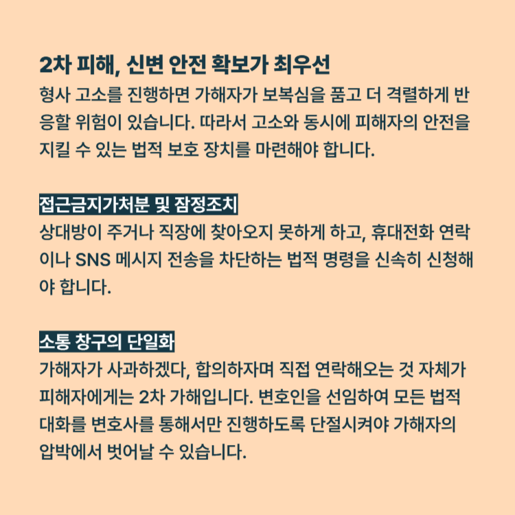 형사 고소를 진행하면 가해자가 보복심을 품고 더 격렬하게 반응할 위험이 있습니다. 따라서 고소와 동시에 피해자의 안전을 지킬 수 있는 법적 보호 장치를 마련해야 합니다.