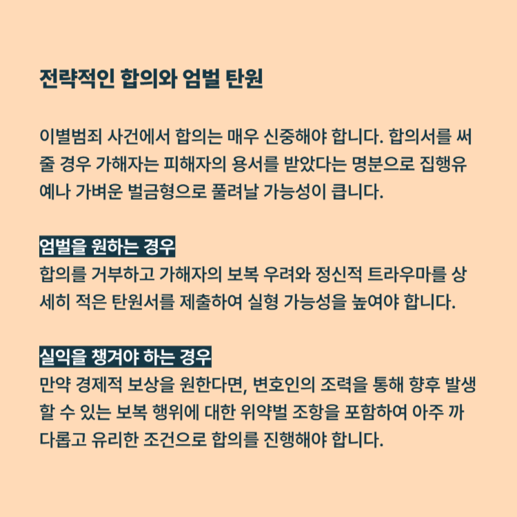 이별범죄 사건에서 합의는 매우 신중해야 합니다. 합의서를 써줄 경우 가해자는 피해자의 용서를 받았다는 명분으로 집행유예나 가벼운 벌금형으로 풀려날 가능성이 큽니다.