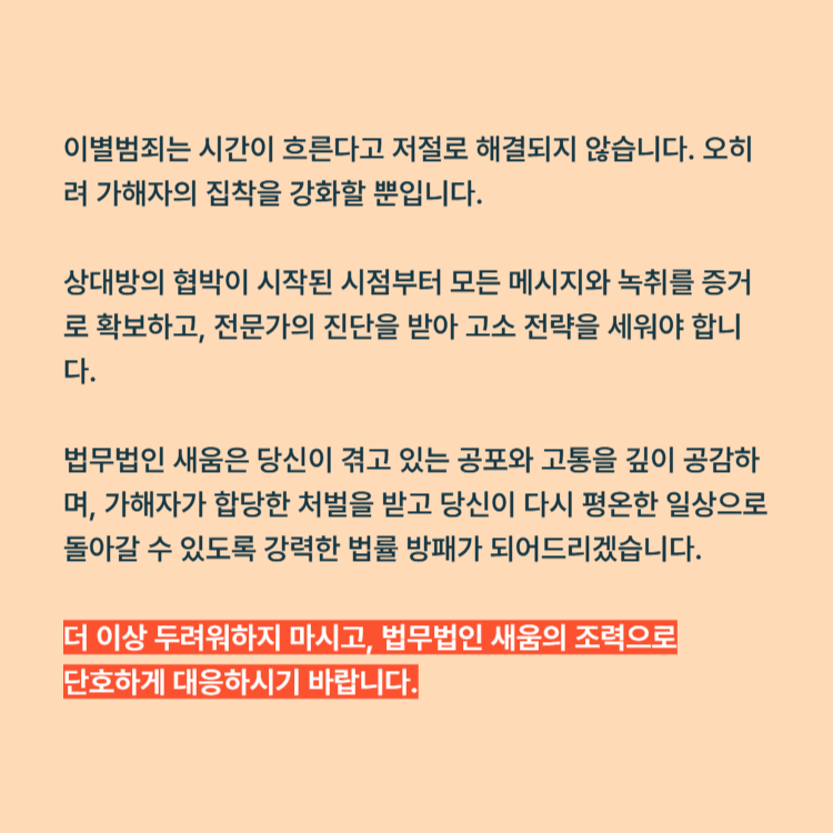 이별범죄는 시간이 흐른다고 저절로 해결되지 않습니다. 오히려 가해자의 집착을 강화할 뿐입니다. 상대방의 협박이 시작된 시점부터 모든 메시지와 녹취를 증거로 확보하고, 전문가의 진단을 받아 고소 전략을 세워야 합니다.
