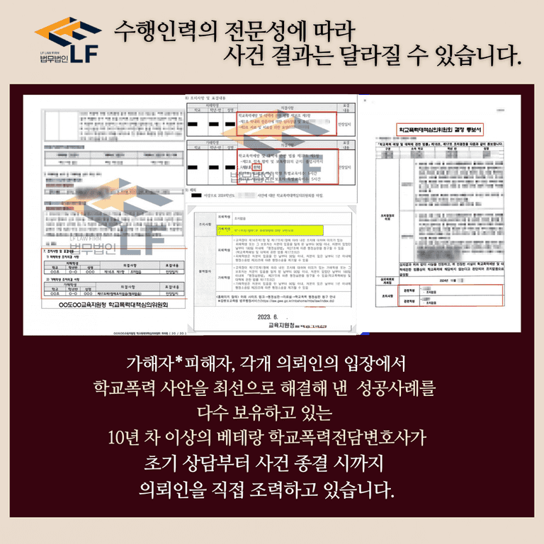 개별적인 상황과 입장에서 최선의 결과를 이끌어 내고자 한다면, 학교폭력 사건 해결 경험이 풍부한 베테랑 학교전문변호사의 조력을 받는 것이 보다 더 유리할 수 있을 것입니다.