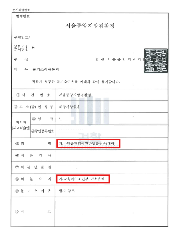 검찰은 의뢰인이 대마 제품을 국내로 반입한 사실은 인정되나, 사안이 비교적 경미하고 투약 흔적이 없는 점을 높이 평가했습니다. 또한 자신의 잘못을 인정하고 반성하는 태도를 고려하여, 재판에 넘기지 않고 교육 이수를 조건으로 기소유예 처분을 내렸습니다.