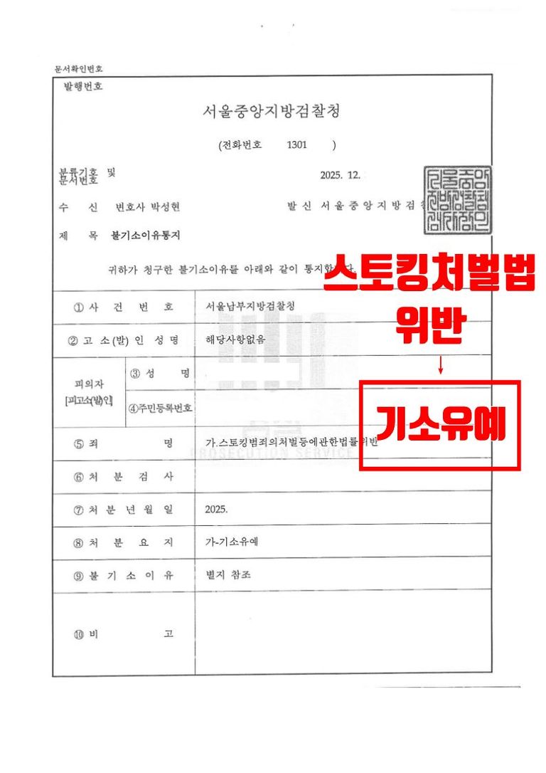 서울남부지방검찰청은 법률사무소 유(唯)의 형사전문변호사의 의견과 적극적인 중재를 받아들여 스토킹처벌법위반과 재물손괴 혐의에는 기소유예 처분을, 협박 혐의에는 공소권 없음 처분을 하였습니다.