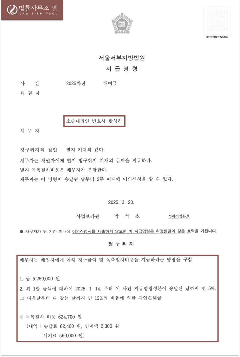 실제로 이 사건에서도 의뢰인을 위해 선제적인 지급명령 신청을 하고 이후 결과에 따라 형사고소를 진행하기로 함에 따라 비용 부담은 낮추고, 실질적인 대응은 가능하게만들 수 있었습니다.