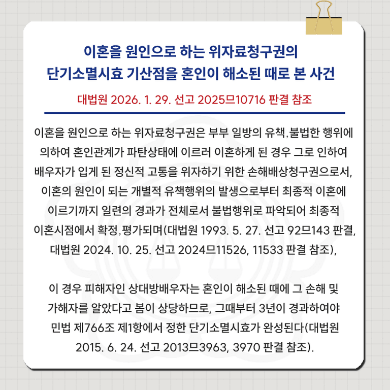 ![[판례분석] 2026년 최신 위자료 소멸시효 재산분할 청구 판례](/_next/image?url=https%3A%2F%2Fd2ai3ajp99ywjy.cloudfront.net%2Fuploads%2Ftitleimage%2Foriginal%2F5b42b2c9f5510479b71ee6b1-original.jpg&w=3840&q=75)