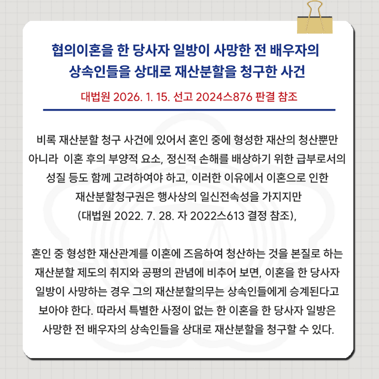 2. 사망한 전 배우자의 상속인에 대한 재산분할 (대법원 2024스876)