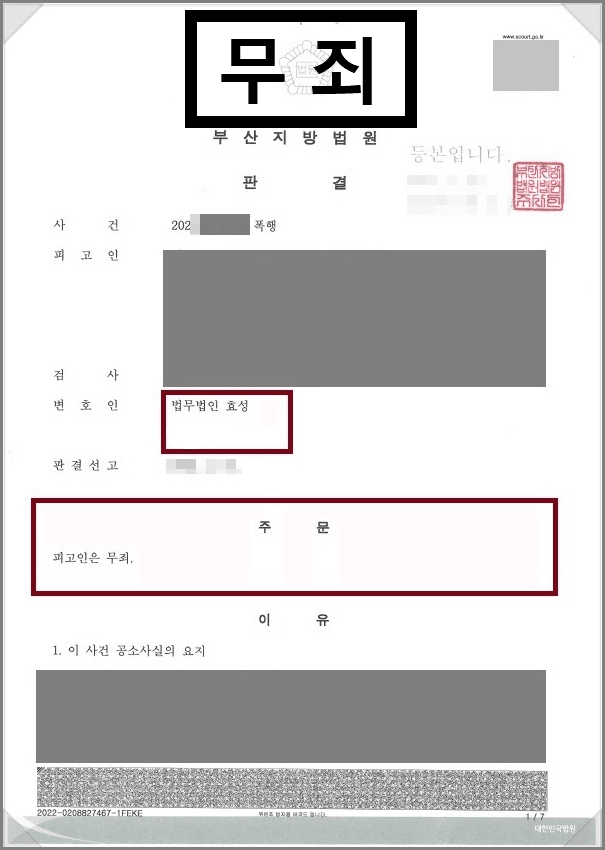 재판부는 법무법인 효성의 변론을 받아들여 범죄의 증거가 전혀 없다며 의뢰인에게 무죄를 선고했습니다.