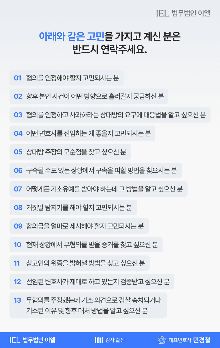 성범죄 전문 가해자 변호사의 실무 경험, 검사출신 민경철 대표변호사의 수사 구조 분석, 그리고 이엘 성범죄 피해자 케어센터의 보호 중심 조력이 맞물리며 사건은 감정적 대립이 아닌 법적 판단으로 정리될 수 있었습니다. 강제추행이나 무고가 문제 되는 사건일수록 초기 대응은 선택이 아니라 필수이며, 법무법인 이엘 성범죄 센터는 이러한 사례를 통해 그 차이를 분명히 보여주고 있습니다.