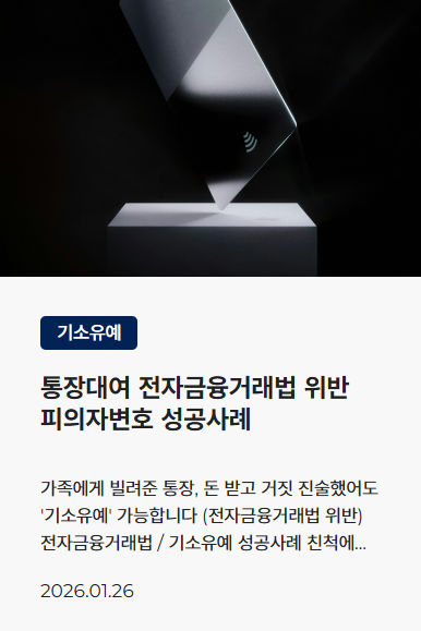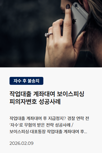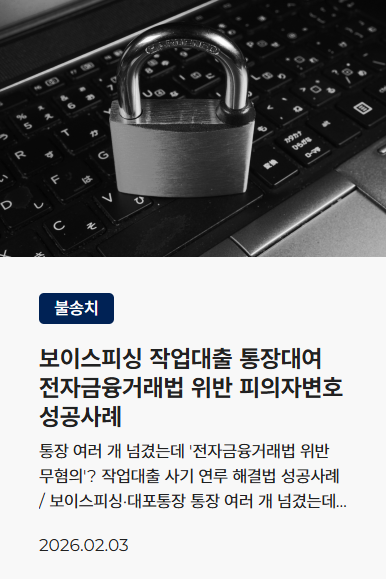 ![[보이스피싱] 작업대출 통장정지? 전자금융거래법위반 처벌 위험성](/_next/image?url=https%3A%2F%2Fd2ai3ajp99ywjy.cloudfront.net%2Fuploads%2Ftitleimage%2Foriginal%2F5c792510d9e024cbb77cc0ae-original.jpg&w=3840&q=75)