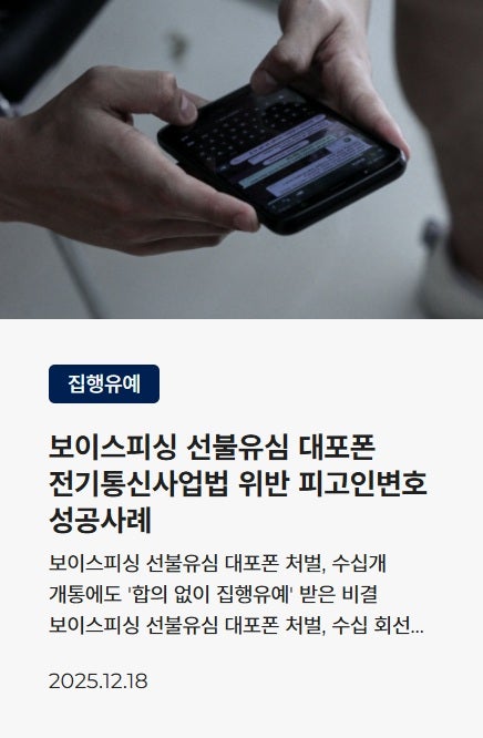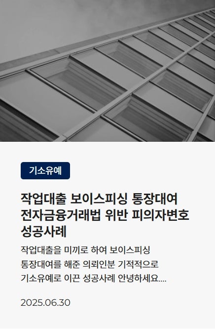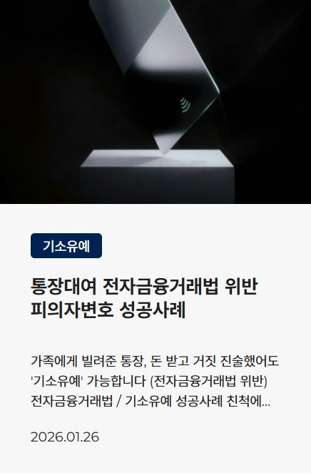 ![[보이스피싱] 전자금융거래법위반 초범실형 경찰조사대처법 방법은?](/_next/image?url=https%3A%2F%2Fd2ai3ajp99ywjy.cloudfront.net%2Fassets%2Fimages%2Fpost%2Fguide_title.jpg&w=3840&q=75)