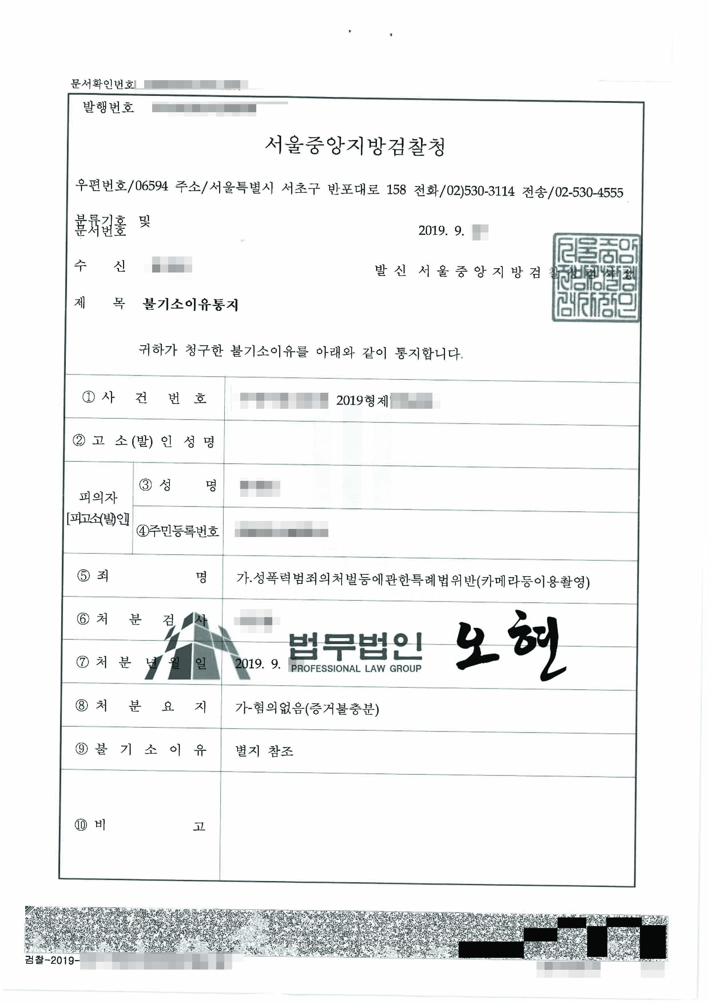 담당검사는 “피의자가 촬영한 사진은 성적 욕망 또는 수치심을 유발살 수 있는 신체를 촬영한 것이라고 보기 어렵다.”며 혐의없음 처분하였습니다.