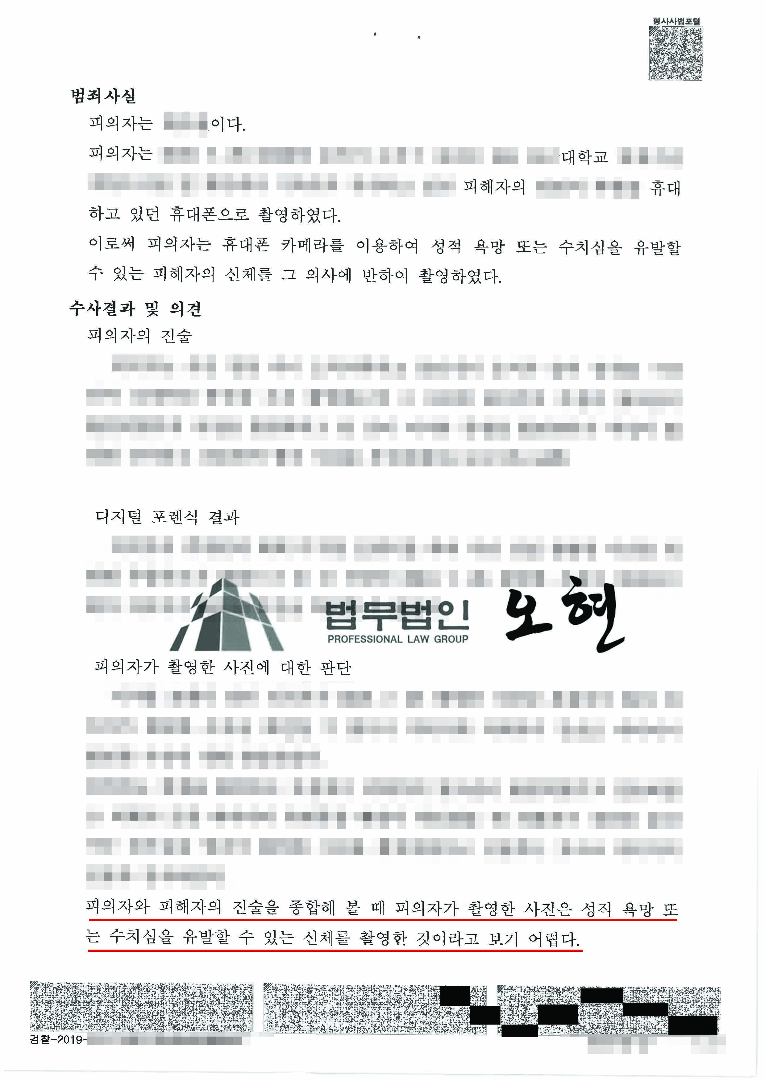 나아가, 본 변호인은 의뢰인의 수사과정에 입회하여 피해자의 진술을 확인하였고, 피해자 진술 중 의뢰인의 입장과 부합하는 내용(촬영 경위, 촬영 당시 상황 등 관련)을 정리한 추가 변호인의견서를 제출하여 변론에 힘을 더하였습니다.