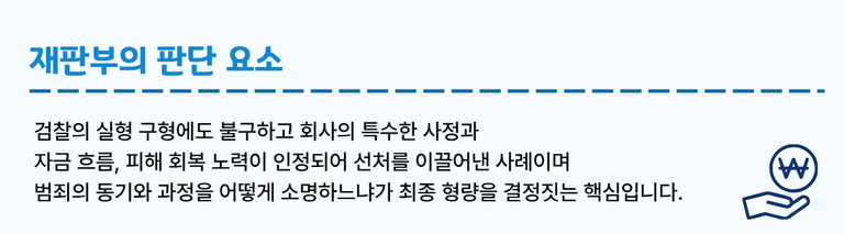 그러나 법원은 회사 상황, 자금 운용 내역, 피해 회복 노력 등을 종합적으로 살폈습니다.