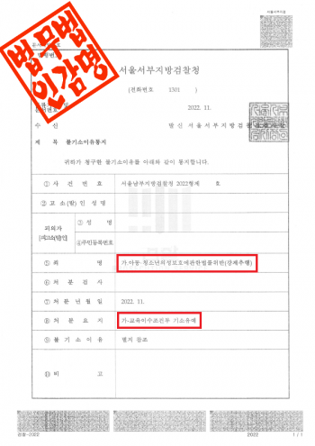 서울남부지방검찰청은 이 사건에 대해 다음과 같은 사유로 불기소 결정을 하였습니다.
