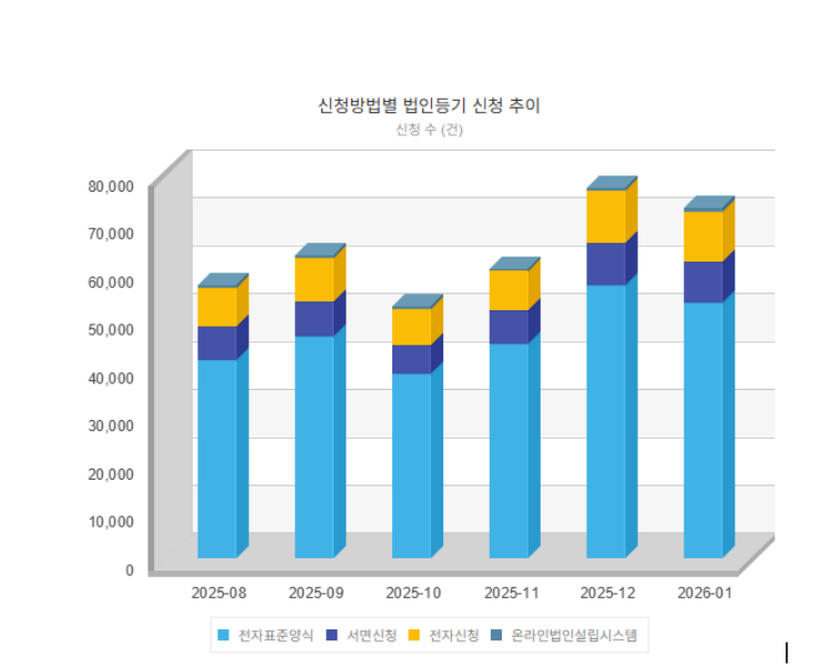 그러나 아직까지도 아래 그래프에서 알 수 있듯이 인터넷등기소에 등기를 신청하는 “전자신청” 비중이 20%가 채 안 됩니다. 전자등기는 여러모로 서류등기(전자표준양식_이폼e-form 포함)보다 편리하고 신속합니다. 본 칼럼에서 온라인으로 법인설립을 하는 방법에 대해 설명드리겠습니다.
