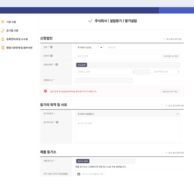 등기맨이 전자등기를 수행하는 절차로 말씀드리면, 먼저 법인설립 필요한 정보 및 서류를 전자문서 형태로 작성하여 인터넷 등기소에 먼저 업로드 합니다.