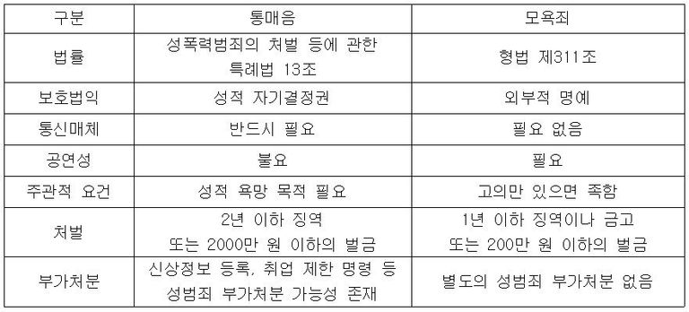 통신매체이용음란죄는 성적 자기결정권을 보호하는 범죄이고, 모욕죄는 사회적 명예를 보호하는 범죄입니다. 통매음은 통신매체 이용과 성적 욕망 목적이 요구되는 목적범이며, 모욕죄는 공연성이 요구되는 일반 고의범이라는 점에서 구조적으로 다릅니다.