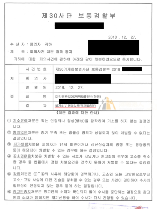 결국 군 검찰은 본 변호인의 변론을 받아들여, 의뢰인 A씨의 마약 수수 및 투약 혐의에 대하여 '혐의없음' 처분을 내렸으며, 이에 의뢰인 A씨는 무사히 남은 군생활을 마칠 수 있게 되었습니다.