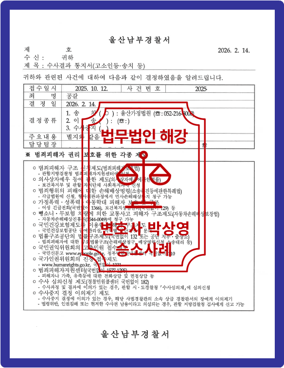 저희 법무법인 해강은 법리적인 검토를 통하여 의뢰인 상황에 맞춘 변호인 의견서 등 작성을 통하여 의뢰인을 위해 최선을 다하였고 이에 [고소대리성공]을 이끌어냈습니다.