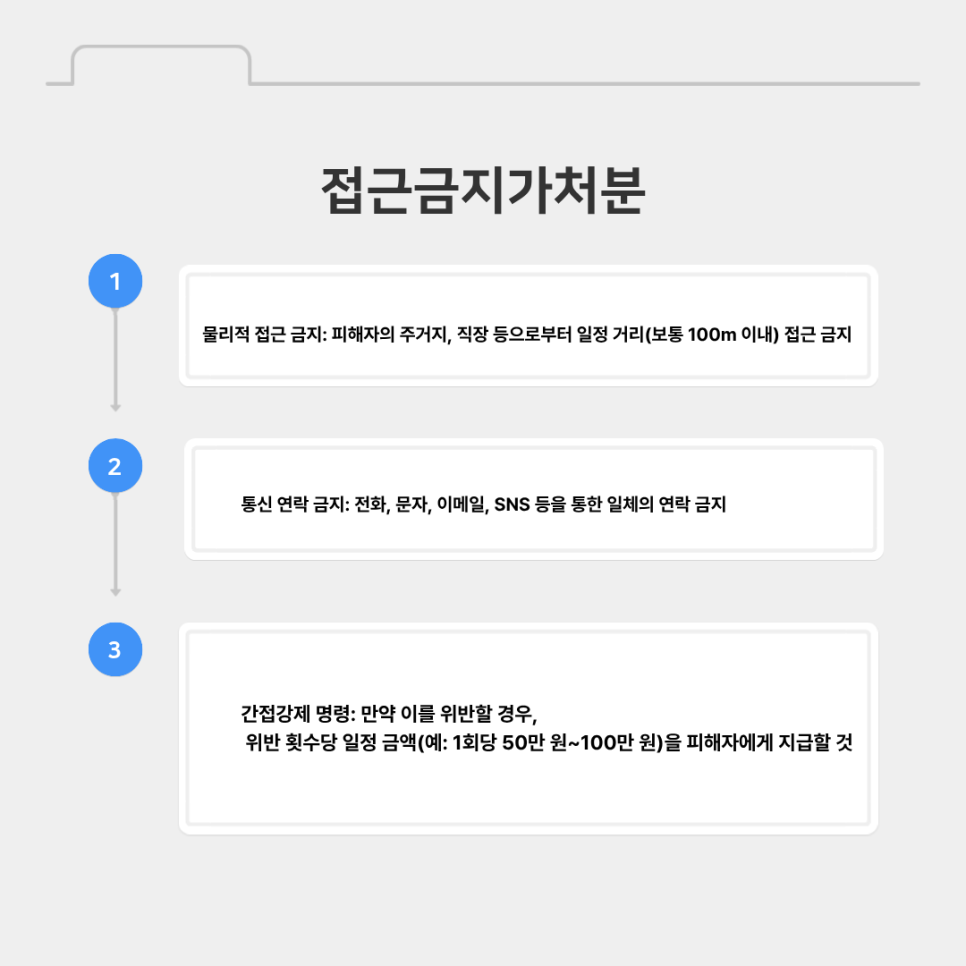 물리적 접근 금지: 피해자의 주거지, 직장 등으로부터 일정 거리(보통 100m 이내) 접근 금지