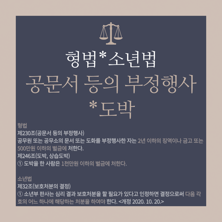 위와 같은 일을 했던 것이 형사 사법 기관에 적발되었고, 그에 따라 의뢰인의 자녀는 공문서 등의 부정행사죄와 도박죄로 처벌받게 생겼는데, 이전에도 가정법원에서 소년보호 처분을 받은 전적이 있어 더욱 더 큰일이라고 했습니다.