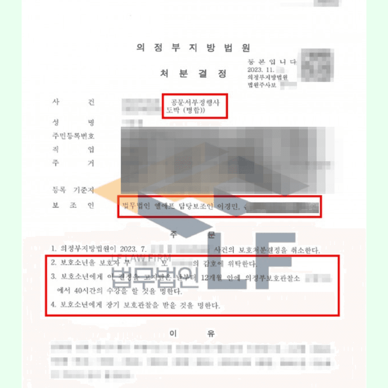 의뢰인의 자녀는 이미 보호처분 전력이 있었고, 공문서 등의 부정행사 및 도박 범행이 연이어 문제 된 상황이었기에, 법원에서 사안을 단순 일탈이 아닌 반복적·복합 비행으로 평가할 가능성이 충분히 존재하였습니다.