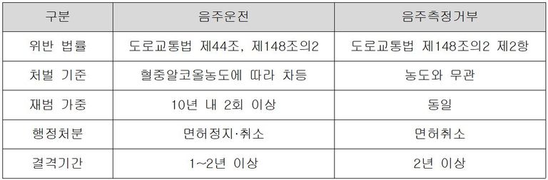 이 표에서 보듯, 음주측정거부는 실제 음주 수치와 관계없이 중형이 예정되어 있다는 점이 가장 큰 차이입니다.