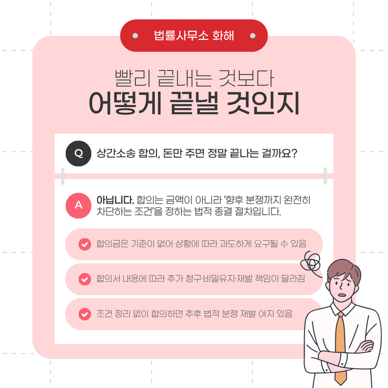 상간소송을 당하면 많은 분들이 가장 먼저 “얼마를 주면 끝나는지”부터 생각합니다. 하지만 합의는 단순히 금액을 정하는 문제가 아니라, 사건을 어떤 조건으로 종결할 것인지 결정하는 법적 절차입니다.