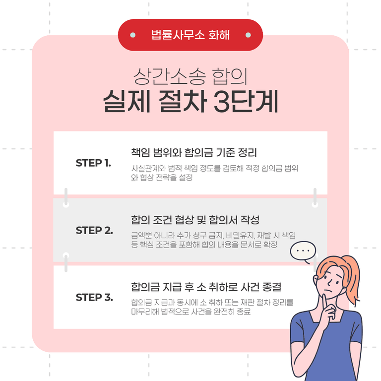상간소송 합의는 단순히 금액만 협의하고 문서에 서명하면 끝나는 과정이 아닙니다. 실제로는 여러 단계를 거쳐 진행되며, 각 단계마다 법적 의미가 다릅니다.