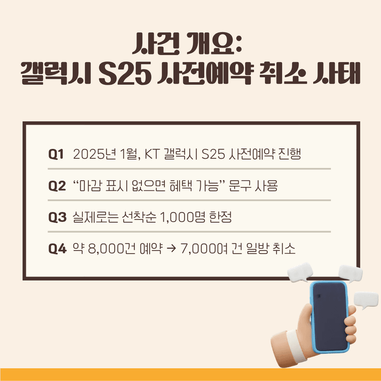 2025년 1월 KT는 자사 사이버몰을 통해 삼성전자의 플래그십 모델인 갤럭시 S25 시리즈의 사전예약을 진행하며 대대적인 홍보를 펼쳤습니다. 당시 이벤트 페이지에는 다음과 같은 문구가 적혀 있었습니다.