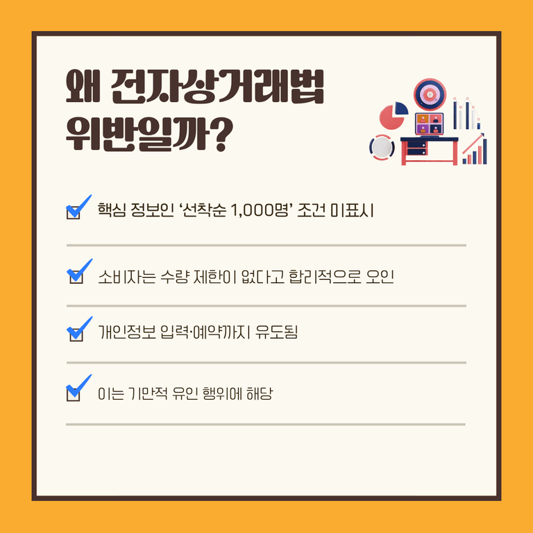 KT는 선착순 1,000명이라는 구매 결정에 결정적인 영향을 미치는 정보를 누락했습니다. 소비자들은 물량이 무제한이거나 충분하다고 믿고 개인정보를 입력하고 예약 절차를 밟았습니다. 이에 따라 공정위는 해당 행위를 소비자의 오인을 유발해 거래를 유도한 기만적 행위로 판단했습니다.