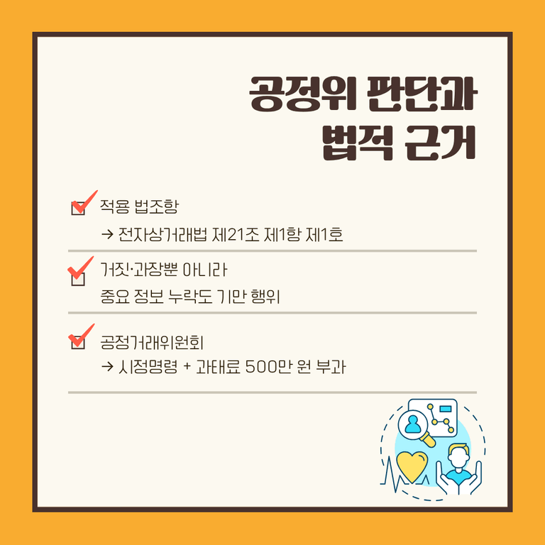 이번 사건에서 공정거래위원회(이하 '공정위')가 적용한 법 조항은 바로 전자상거래법 제21조 제1항 제1호입니다. 본 조항은 사업자가 거짓 또는 과장된 사실을 알리거나, 기만적인 방법을 사용하여 소비자를 유인하거나 거래하는 행위를 명확히 금지하고 있습니다. 여기서 말하는 ‘기만’이란 반드시 명백한 허위 사실을 말해야만 성립하는 것은 아닙니다. 소비자가 합리적으로 기대할 수 있는 중요한 정보를 누락하거나, 일부 사실만을 강조하여 전체 거래 조건을 오인하게 만드는 경우 역시 기만적 행위에 해당할 수 있습니다.