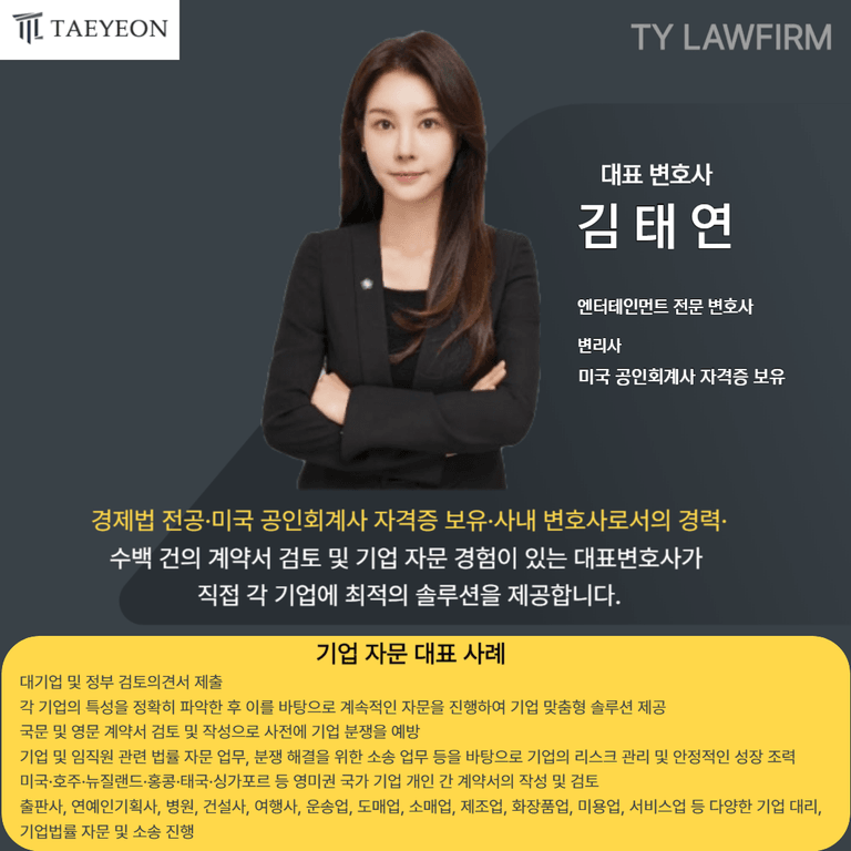 그렇기에, 기획사나 콘텐츠제작회사와의 계약이나 광고 계약을 앞둔 유명인이나 해외 진출을 앞둔 기업, 연예인들은 새로운 계약을 체결하기 전 반드시 전문성이 보장된 법률전문가에게 계약서를 검토 받으셔야 합니다.