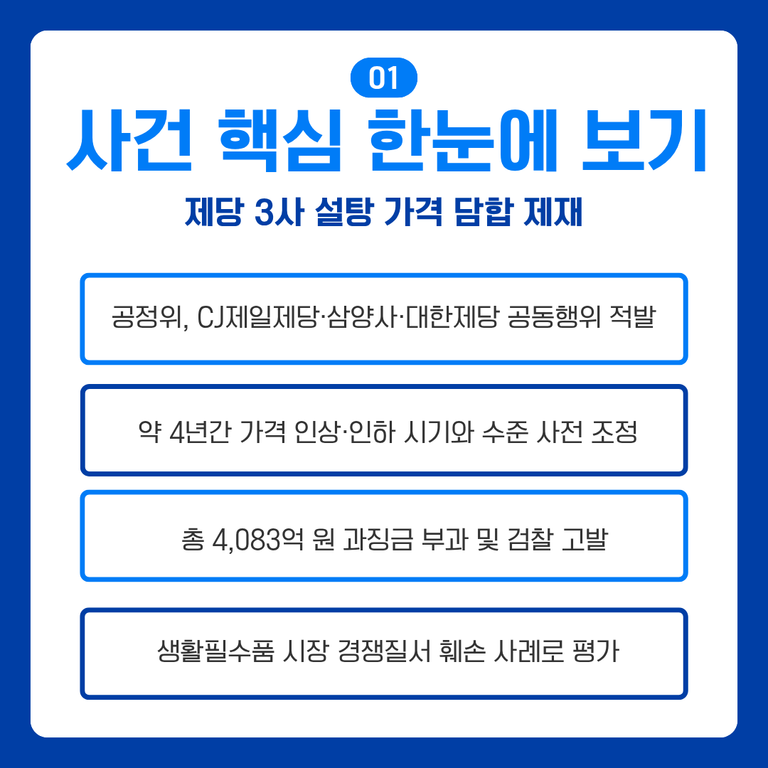 공정위는 제당 3사가 약 4년간 설탕 가격의 인상·인하 폭과 시기를 사전에 합의하여 실행한 행위를 적발하고, 총 4,083억 원의 과징금을 부과하였습니다.