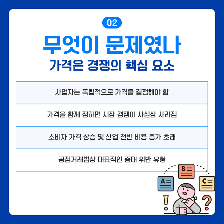 가격은 시장 경쟁의 핵심 요소이므로, 이를 공동으로 결정하는 행위는 공정거래법상 대표적인 중대 위반 유형에 해당합니다.