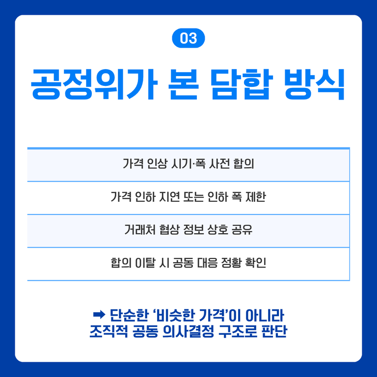 등의 실행 구조가 확인되었다고 공정위는 설명하였습니다. 이는 우발적 접촉이 아니라 일정한 체계를 갖춘 공동행위로 판단된 배경이 되었습니다.