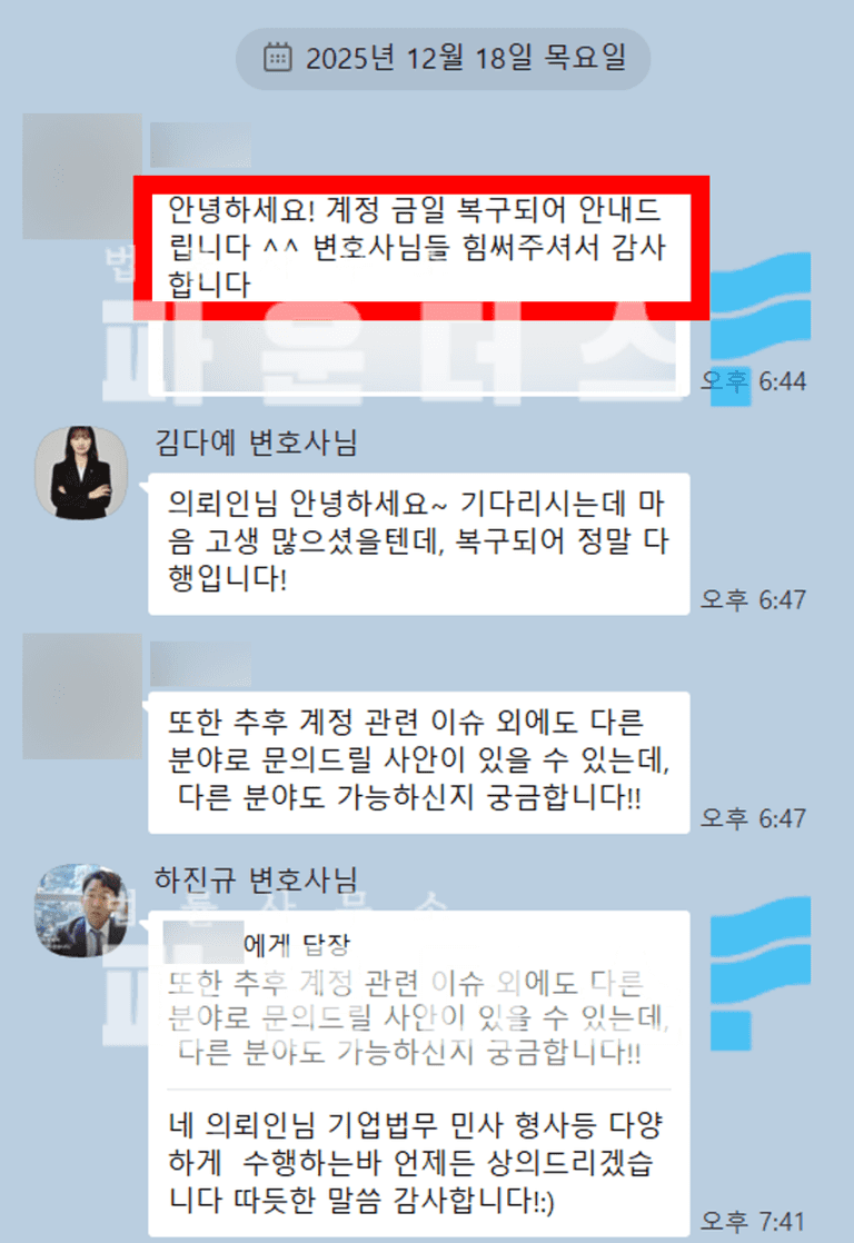 변호인은 기존 유사 사례에 대한 대응 경험을 바탕으로 내용증명을 구성했고 결과적으로 계정은 원만히 복구되어 의뢰인은 소중한 기록을 다시 되찾을 수 있었습니다.