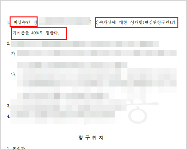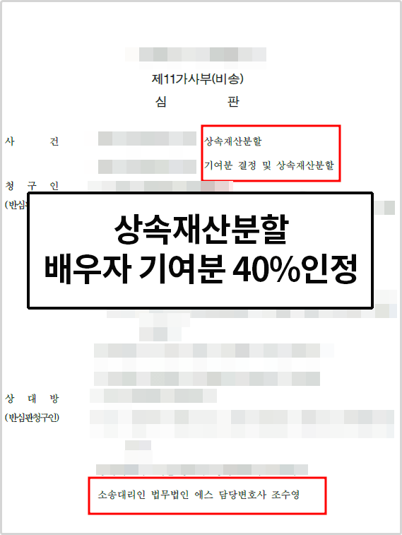 장인, 장모님은 사위의 기여분을 부인하며 끝까지 법정상속분대로 분할할 것을 요청하였으나, 법원에서는 남편의 기여분을 40%로 인정해 주었습니다.