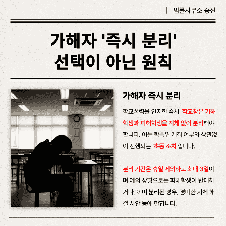 학교폭력을 인지한 즉시, 학교장은 가해학생과 피해학생을 지체 없이 분리해야 합니다.